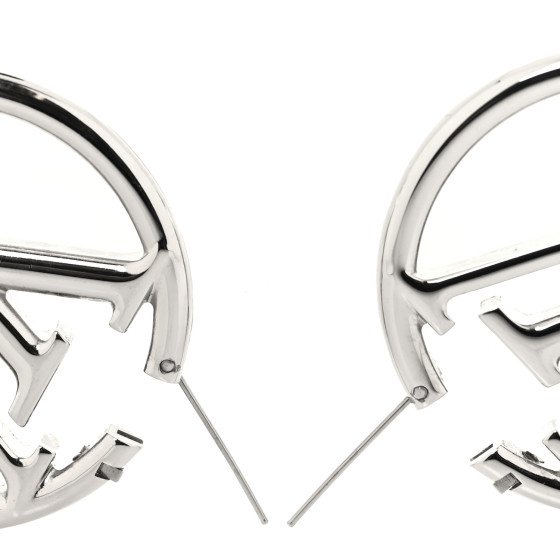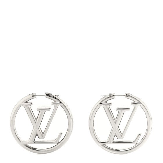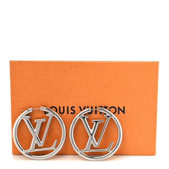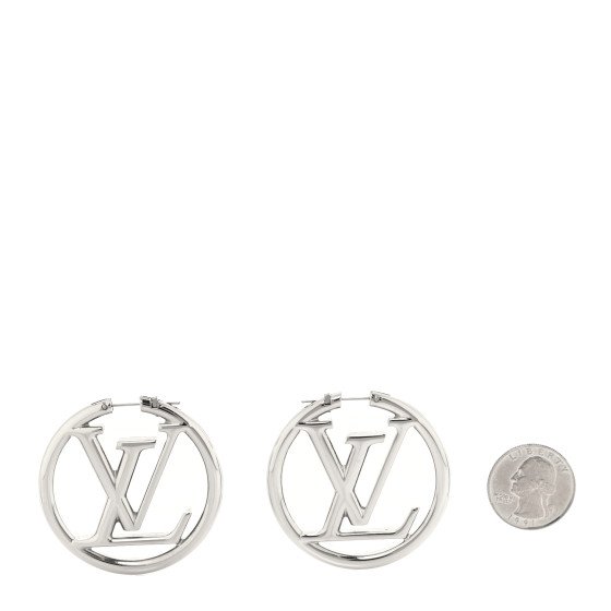 These are a pair of Louis Vuitton Palladium Louise Hoop Earrings in silver. They feature LV logos set inside circular hoops with a polished silver finish.