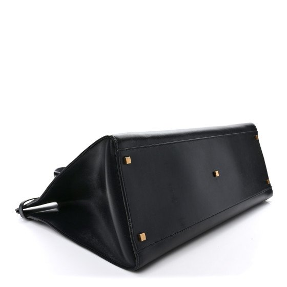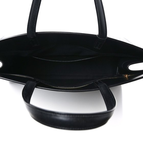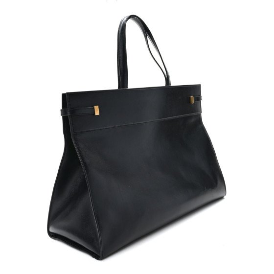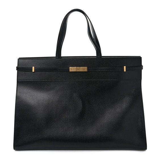 This is an SAINT LAURENT Calfskin Large Manhattan Shopper Tote Black. This elegant tote is crafted of luxuriously textured calfskin leather in black. The shoulder bag features leather strap handles with brass hardware. The top is open to a black fabric interior with zipper and patch pockets.